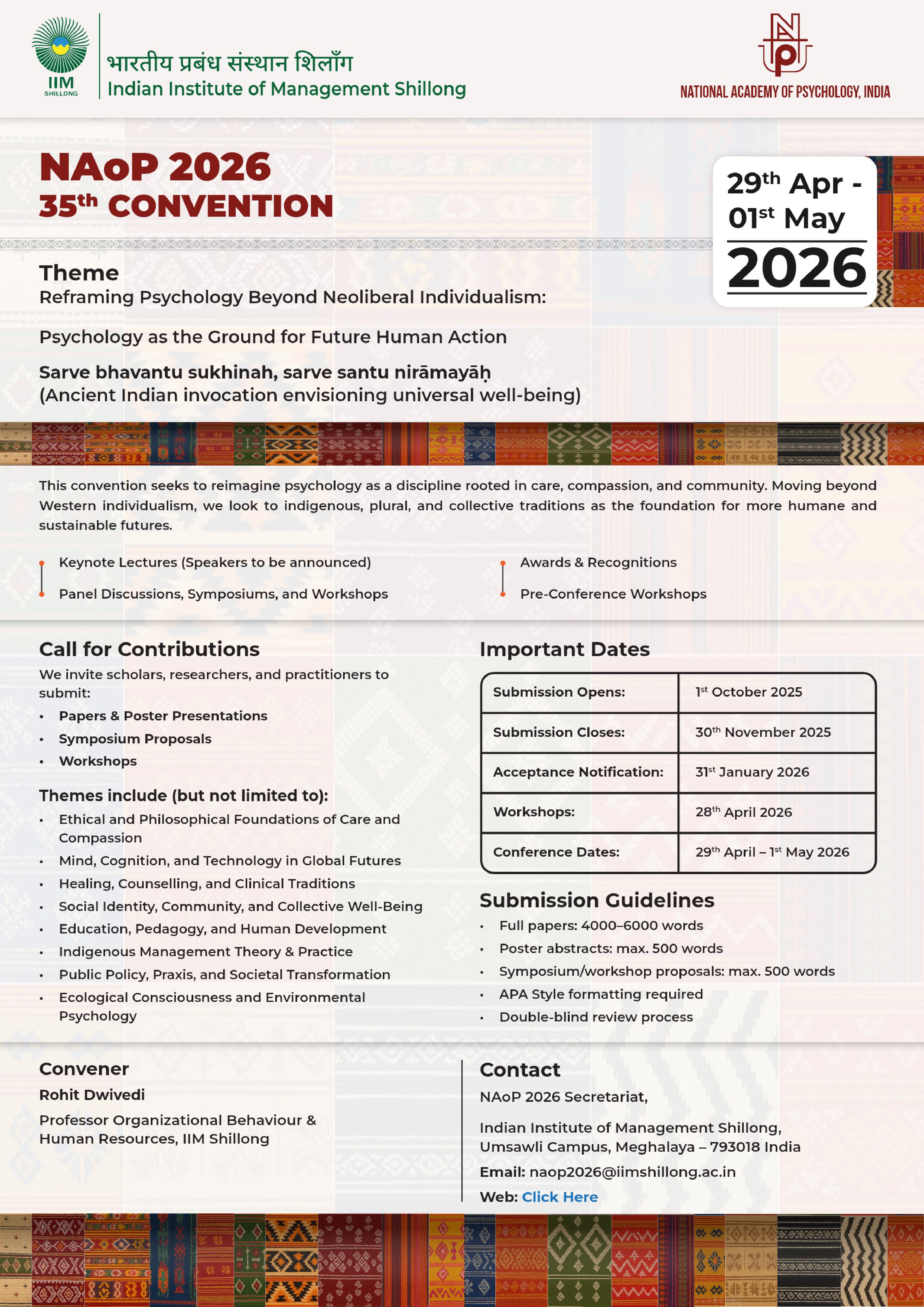The Annual Convention is NAOP’s flagship event and hosting it provides a unique opportunity for institutions to bring together leading national and international scholars, showcase their academic strengths, and contribute to advancing psychology in India. Institutions interested in hosting the Annual Convention of the National Academy of Psychology (NAOP) are invited to express their interest to the Academy. Proposals may be submitted by NAOP members on behalf of their institutions to the Chair, Conference Committee (Prof. Tushar Singh, tusharsinghalld@gmail.com) with a copy to the Secretary General, NAOP. The Academy will work in close collaboration with the host institution on program design, scheduling, and outreach to ensure that every Annual Convention is academically rigorous, inclusive, and of national as well as international significance.