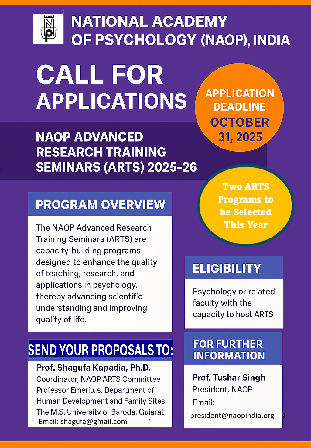 The National Academy of Psychology (NAOP), India has launched the Advanced Research Training Seminar (ARTS) initiative to strengthen research capacity in psychology and allied disciplines. Conceived as a flagship training program, NAOP–ARTS is designed to raise the quality of research, publications, and applications of psychological science, ultimately contributing to a deeper understanding of human nature and the welfare of society.